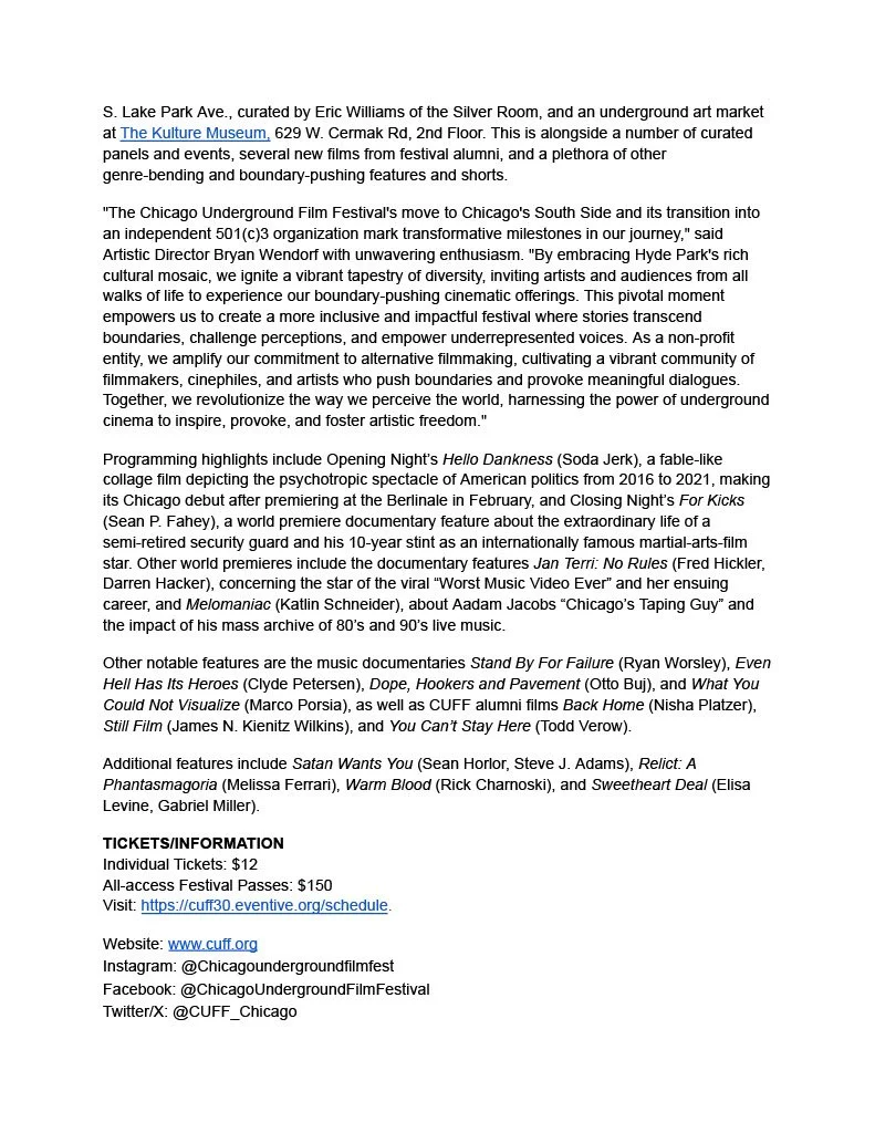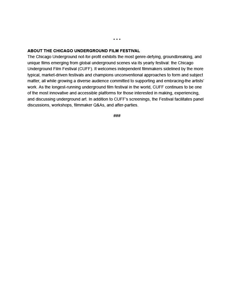 The Chicago Underground NFP exhibits the most genre-defying, groundbreaking, and unique films emerging from underground scenes via our yearly festival: the Chicago Underground Film Festival (CUFF). We welcome independent artists sidelined by the more typical, market-driven fests and champion their unconventional approach to form and subject matter - all while growing a diverse audience committed to supporting and embracing their work.